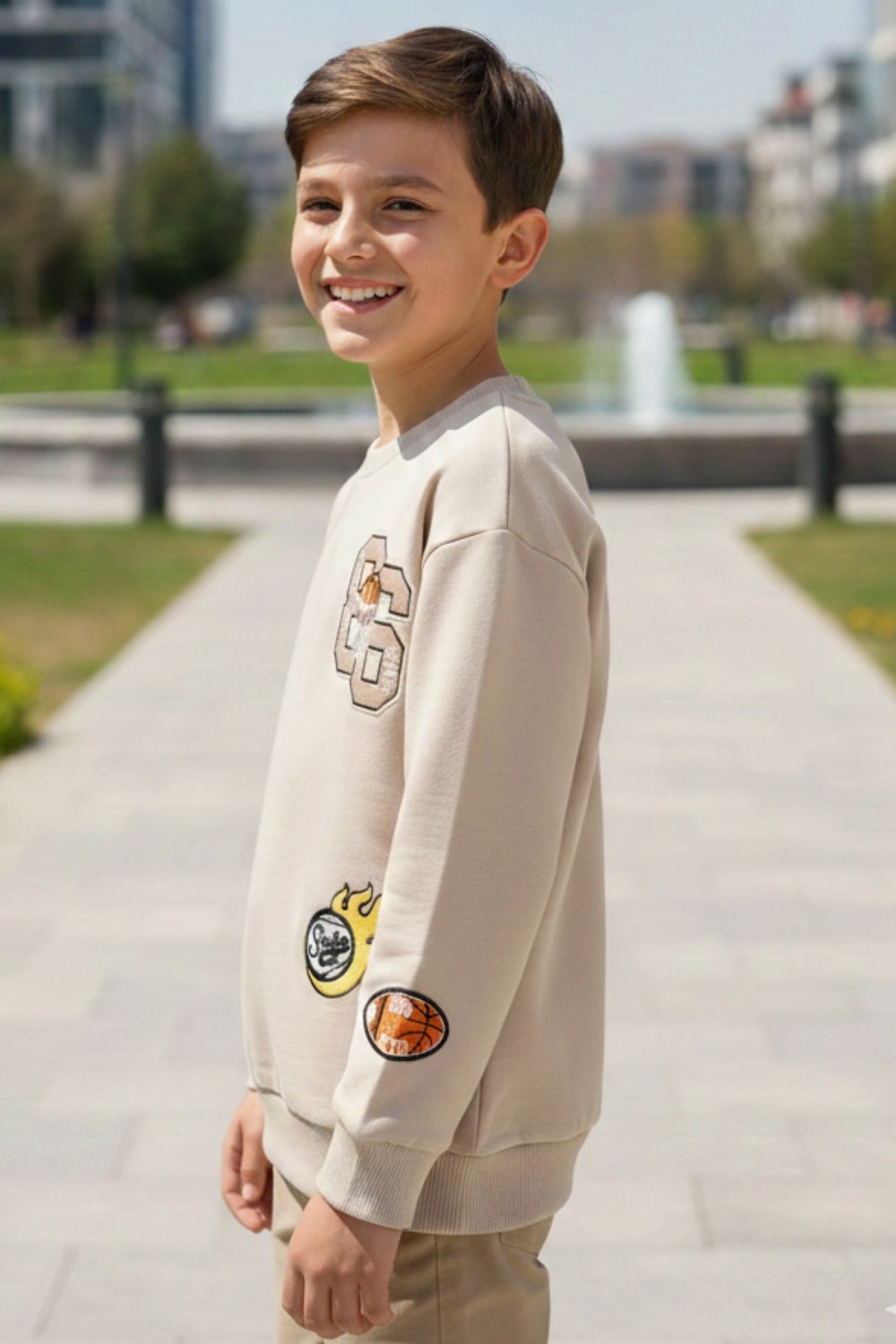 Yumuşak ve esnek yapısıyla günlük kullanımda rahatlık sağlayan bej rengi sweatshirt, %85 pamuk ve %5 elastan içeriğiyle konforu ön planda tutar. Modern ve dinamik tasarımı, üzerindeki renkli patch detaylarıyla şıklığına şıklık katar. Türkiye’de üretilen bu sweatshirt, hafif elastik yapısı sayesinde vücuda tam oturur, hareket özgürlüğü sunar.