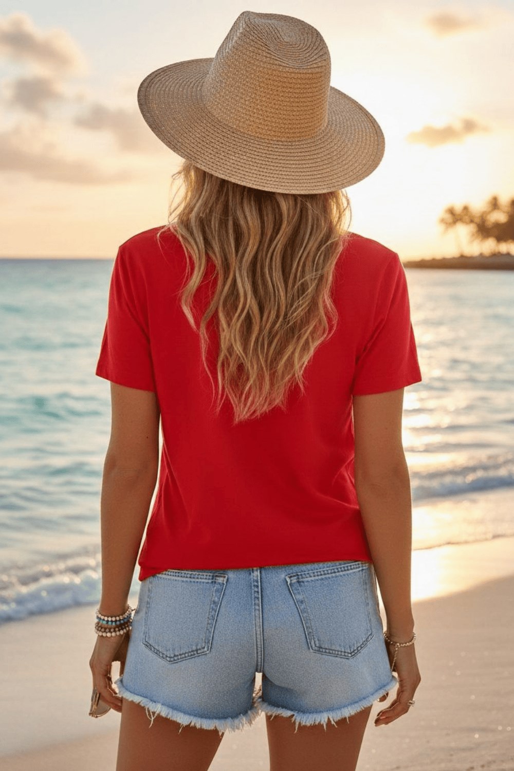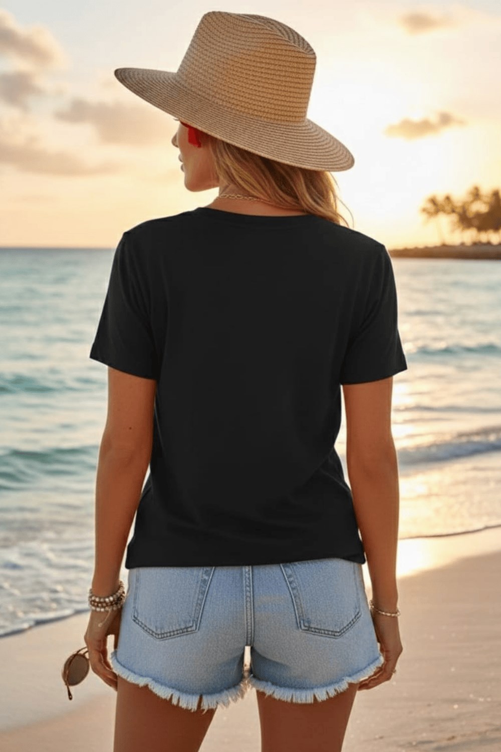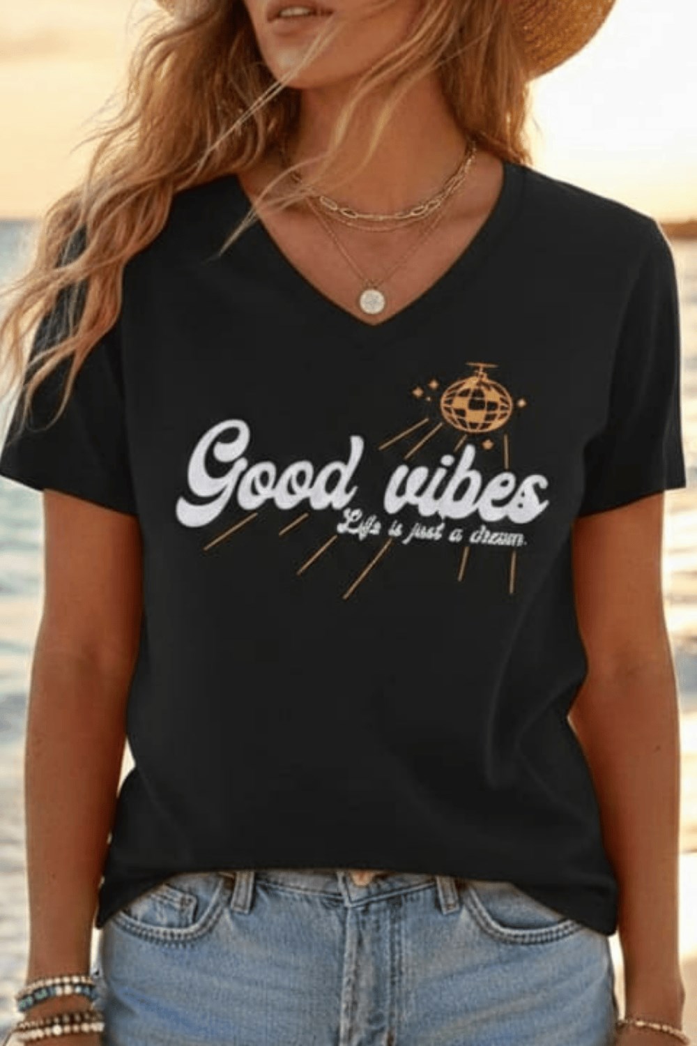 Tasarım: Şık V yaka kesimi ve ikonik "Good Vibes" baskısıyla hem günlük hem de plaj şıklığı için idealdir.