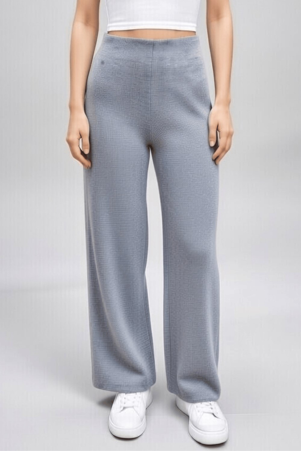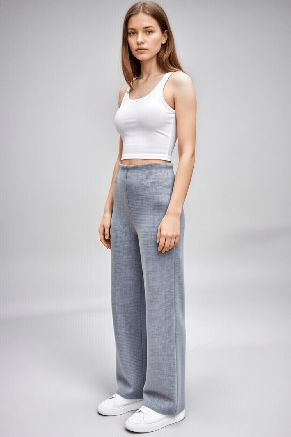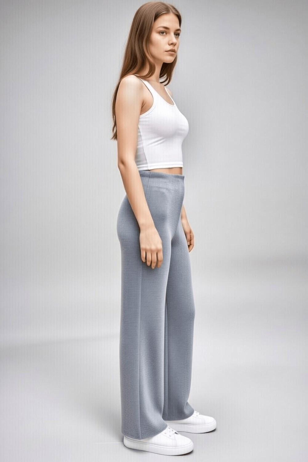 Yüksek bel, bol paça triko pantolon. Hafif waffle dokusuyla hem rahat hem şık. Günlük kombinlerin vazgeçilmezi.