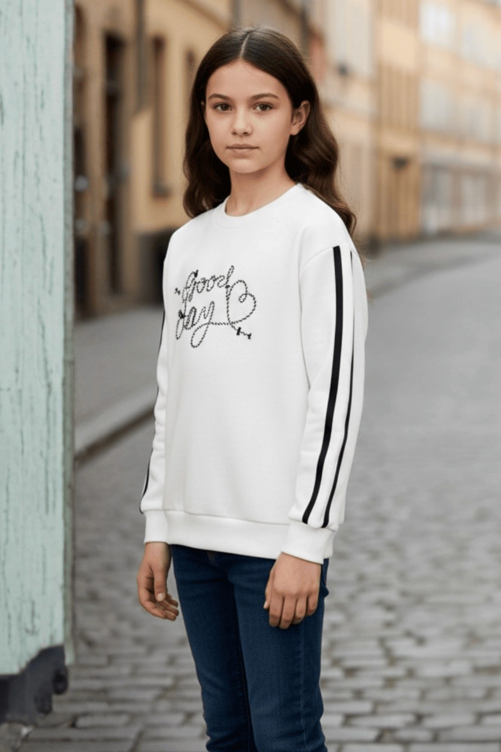 Özel tasarım olan bu beyaz sweatshirt, ön kısmında yer alan “Great Day” nakış detaylarıyla dikkat çeker. Siyah şeritli kolları ve rahat kesimiyle hem şık hem konforlu bir stil sunar.