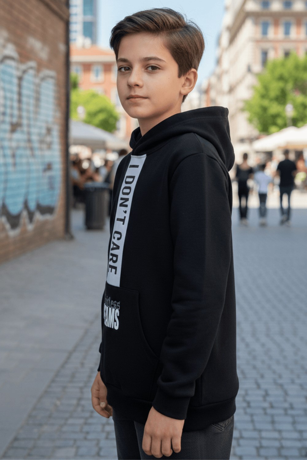 Şık ve rahat tasarımıyla dikkat çeken erkek çocuk kapüşonlu sweatshirt, ön kısmındaki “I DON’T CARE” ve “Limitless DREAMS” yazı baskısıyla modern bir tarz sunar. %70 pamuk içeriği sayesinde yumuşak ve nefes alabilen kumaşı, gün boyu konfor sağlar. %25 polyester dayanıklılık katarken, %5 elastan esnek yapısıyla hareket özgürlüğü verir. Günlük kullanım, okul veya dışarı çıkarken ideal bir tercihtir.